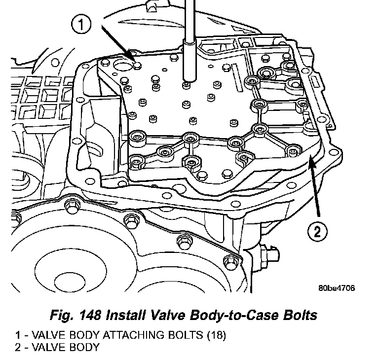 64. Install and torque valve body-to-case bolts to 12 Nm (105 inch lbs.) (Fig. 148).
