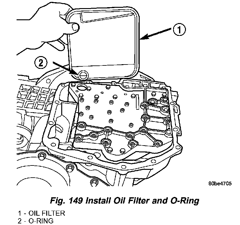 66. Apply an 1/8 inch bead of Mopar ATF RTV (MSGF41) to oil pan and immediately install to case (Fig. 150).