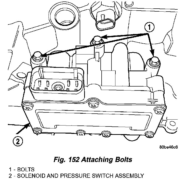 69. Install and tighten solenoid/pressure switch assembly-to-transaxle case bolts to 12 Nm (110 inch lbs.) (Fig. 152).