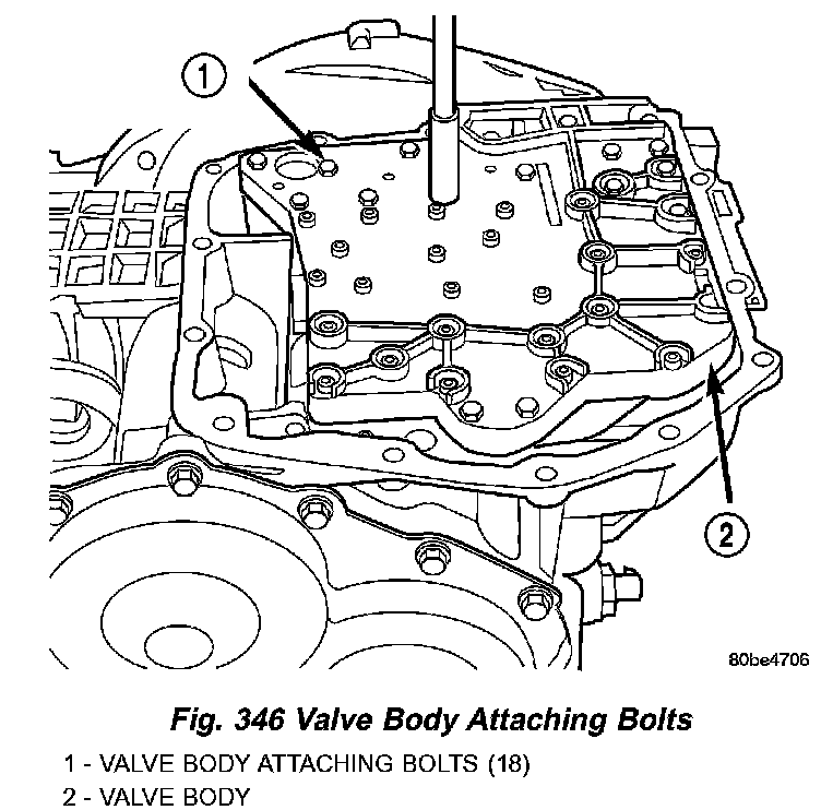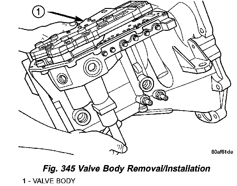 1. Install valve body assembly to transaxle (Fig. 345). Install and torque valve body-to-transaxle case bolts (Fig. 346) to 12 Nm (105 in. lbs.).