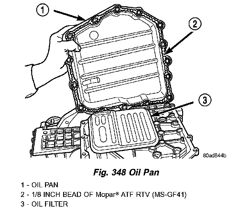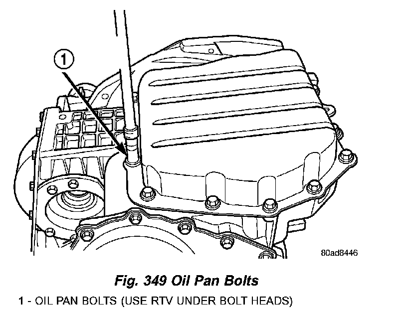 3. Ensure the transaxle oil pan and transaxle case sealing surfaces are clean and dry. Install an 1/8" bead of Mopar ATF RTV (MS-GF41) to the oil pan and install (Fig. 348). Torque oil pan-to-transaxle case bolts (Fig. 349) to 19 Nm (165 in. lbs.).