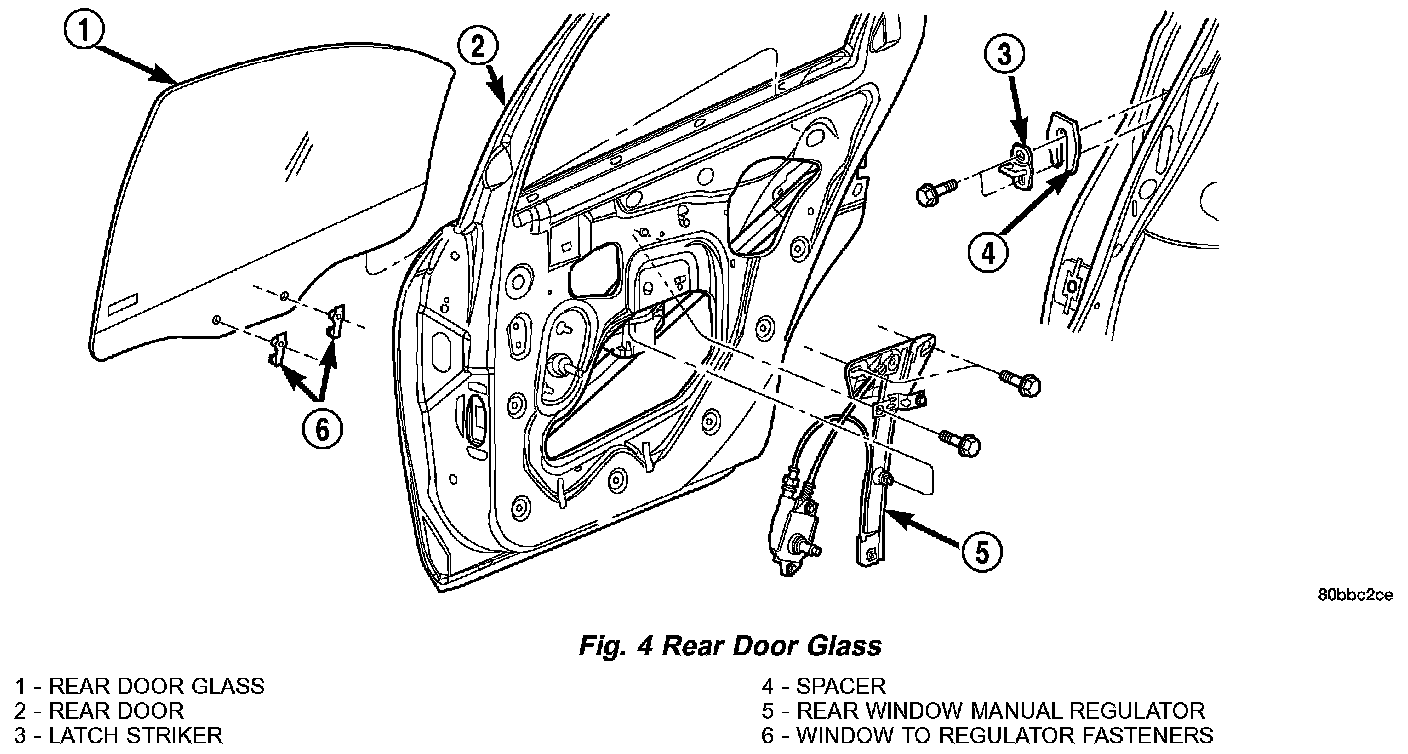 3. Loosen bolts attaching rear lower run channel to inner door panel (Fig. 4).