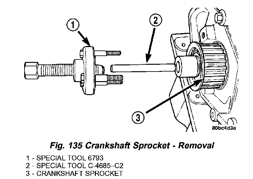 3. Remove crankshaft sprocket using Special Tool 6793 and insert C-4685-C2 (Fig. 135).
