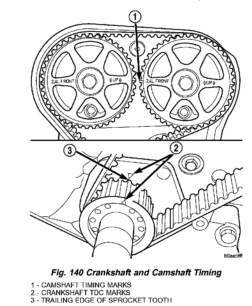 7. Rotate the crankshaft CLOCKWISE two complete revolutions manually for seating of the belt, until the crankshaft is repositioned at the TDC position. Verify that the camshaft and crankshaft timing marks are in proper position (Fig. 140).