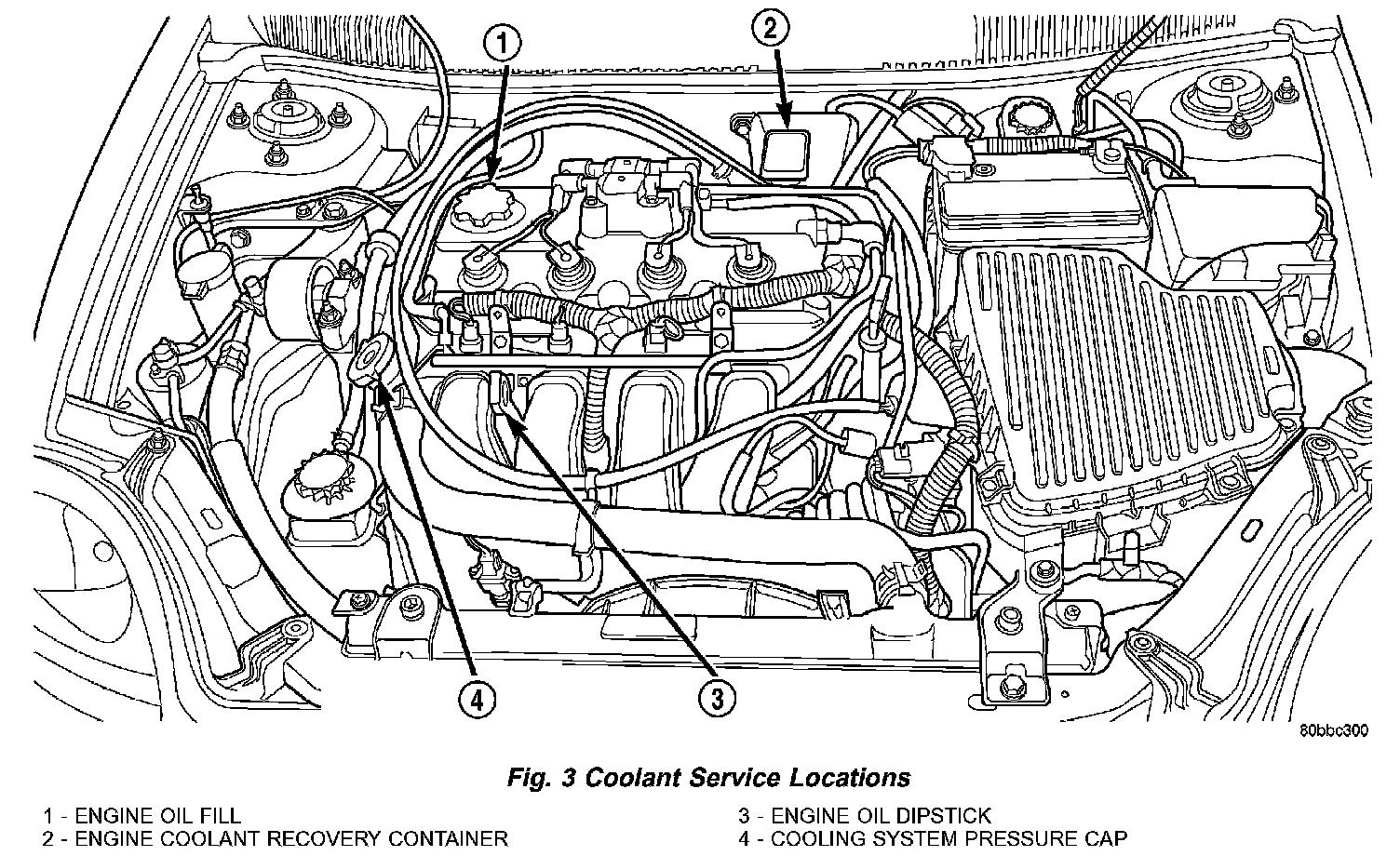 When servicing requires a coolant level check in the engine, the engine must be off and not under pressure. Drain several ounces of coolant from the radiator draincock while observing the coolant recovery container. Coolant level in the container should drop slightly. Then remove the pressure cap, (Fig. 3). Coolant should be to the top of the pressure cap neck. If not, and the coolant level in the recovery container is at the ADD mark there is a air leak in the recovery system. Check hose or hose connections to the recovery container, radiator filler neck or the pressure cap seal to the radiator filler neck for leaks.