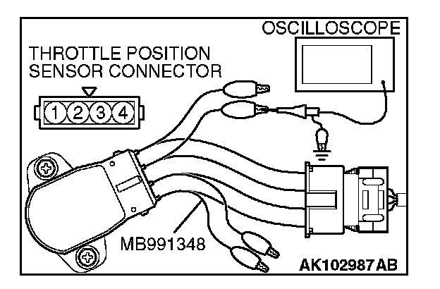 1. Disconnect the throttle position sensor connector and connect the test harness special too (MB991348) in between. (All terminals should be connected.)