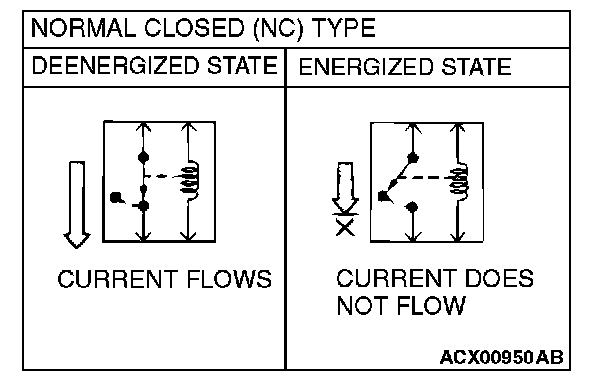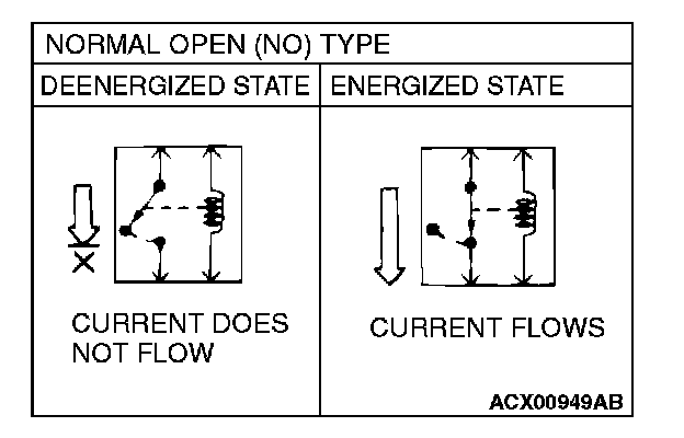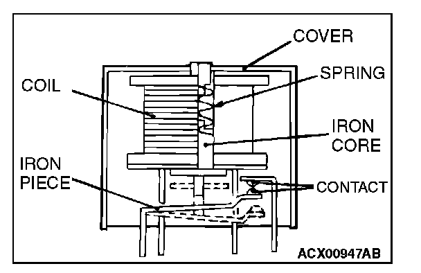 NOTE: The deenergized state means that no current is flowing through the coil. The energized state means that current is flowing through the coil.1. When current flows through the coil of a relay, its core is magnetized to attract the iron piece, closing (ON) the contact at the tip of the iron piece. When the coil current is turned off, the iron piece returns to its original position by a spring, opening the contact (OFF).