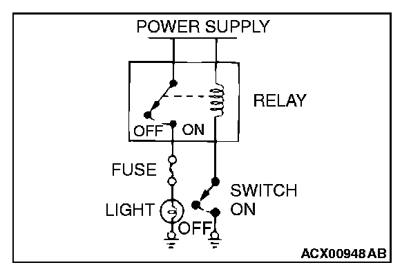 2. By using a relay, a heavy current can be turned on and off by a switch using much less current. For example, in the circuit shown here, when the switch is turned on (closed), current flows to the coil of the relay. Then, its contact is turned on (closed) and the light comes on. The current flowing through the switch is much less than that for the light.