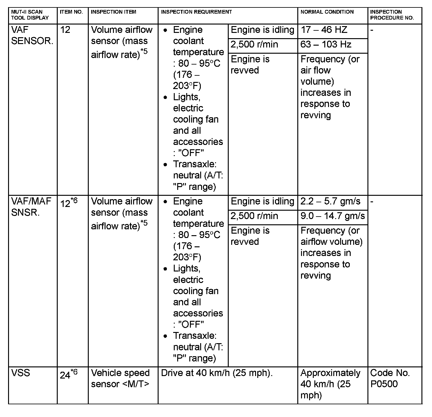 - *5: In a new vehicle [driven approximately 500 km (311 miles) or less], the volume airflow sensor output frequency is sometimes 10% higher than the standard frequency.