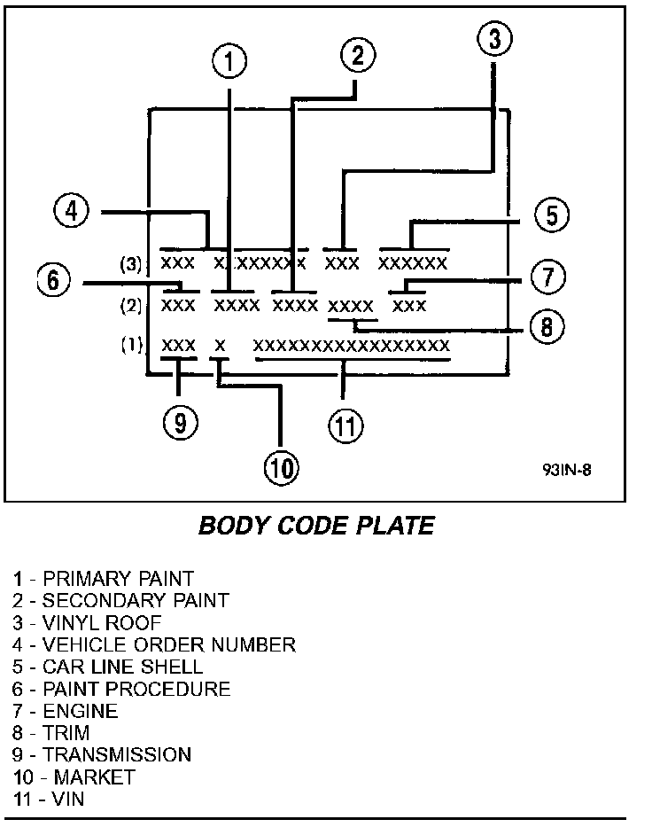 There are seven lines of information on the body code plate. Lines 4, 5, 6, and 7 are not used to define. Information reads from left to right, starting with line 3 in the center of the plate to line 1 at the bottom of the plate.