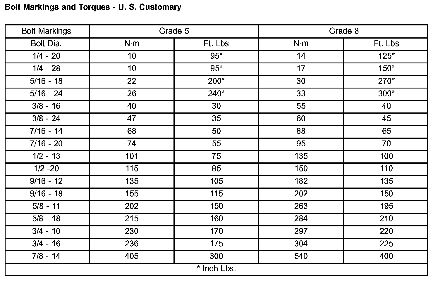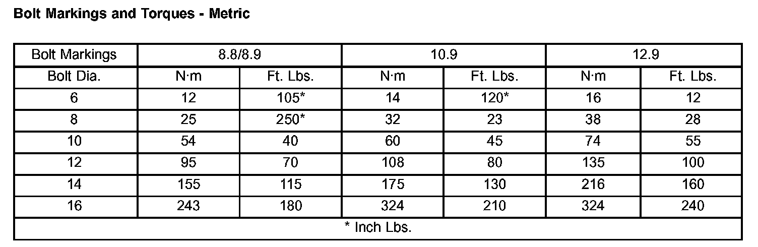 The SAE bolt strength grades range from grade 2 to grade 8. The higher the grade number, the greater the bolt strength. Identification is determined by the line marks on the top of each bolt head. The actual bolt strength grade corresponds to the number of line marks plus 2. The most commonly used metric bolt strength classes are 9.8 and 10.9. The metric strength class identification number is imprinted on the head of the bolt. The higher the class number, the greater the bolt strength. Some metric nuts are imprinted with a single-digit strength class on the nut face. Refer to the Fastener Identification and Fastener Strength Charts.