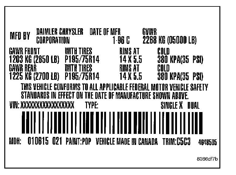 A vehicle certification label is attached to every DaimlerChrysler Corporation vehicle. The label certifies that the vehicle conforms to all applicable Federal Motor Vehicle Standards. The label also lists: