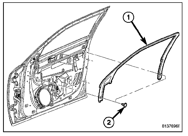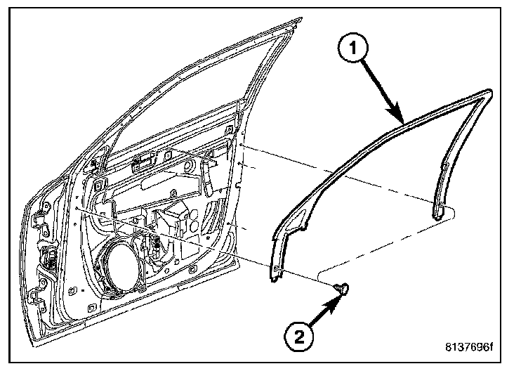 3. Remove the two push pins (2) that secure the window trim molding (1) to the front door.