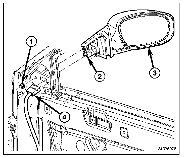 3. Connect the door wire harness connector (4) to the mirror electrical connector (2).