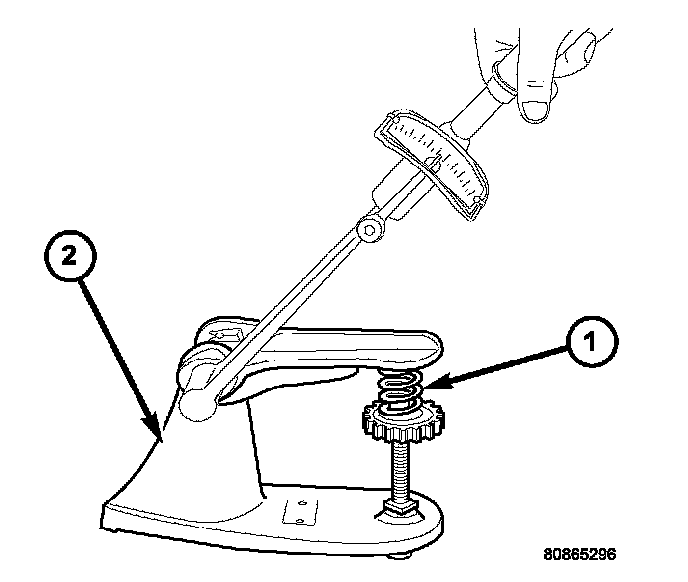 Whenever valves have been removed for inspection, reconditioning or replacement, valve springs (1) should be tested. As an example; the compression length of a spring to be tested is 38.00 mm (1.496 inch). Turn the table of Tool C-647 (2) until surface is in line with the 38.00 mm (1.496 inch) mark on the threaded stud and the zero mark on the front. Place spring (1) over stud on the table and lift compressing lever to set tone device. Pull on torque wrench until ping is heard. Take reading on torque wrench at this instant. Multiply this reading by two. This will give the spring load at test length. Fractional measurements are indicated on the table for finer adjustments. Refer to Engine Specifications to obtain specified height and allowable tensions. Replace any springs that do not meet specifications.