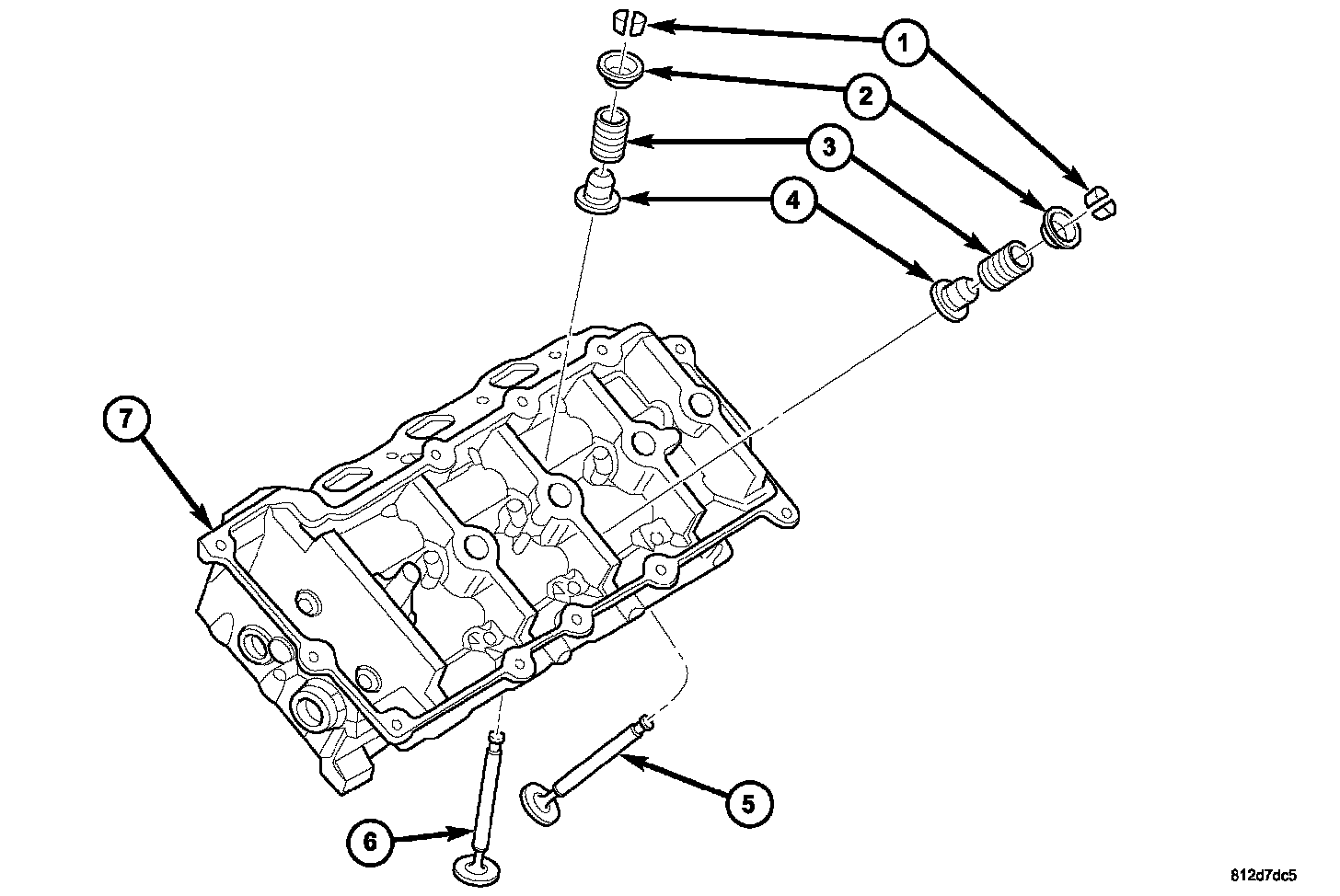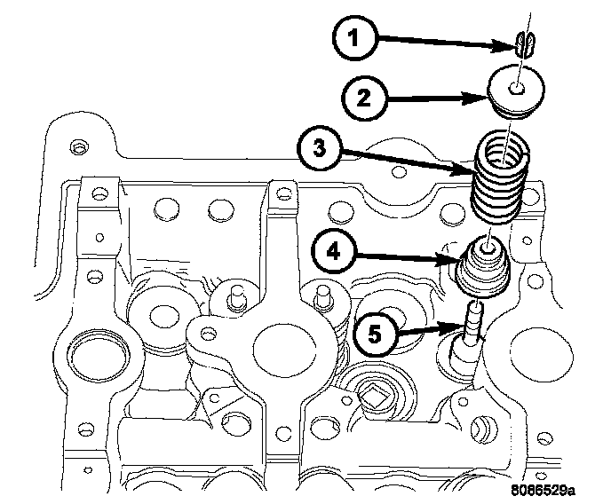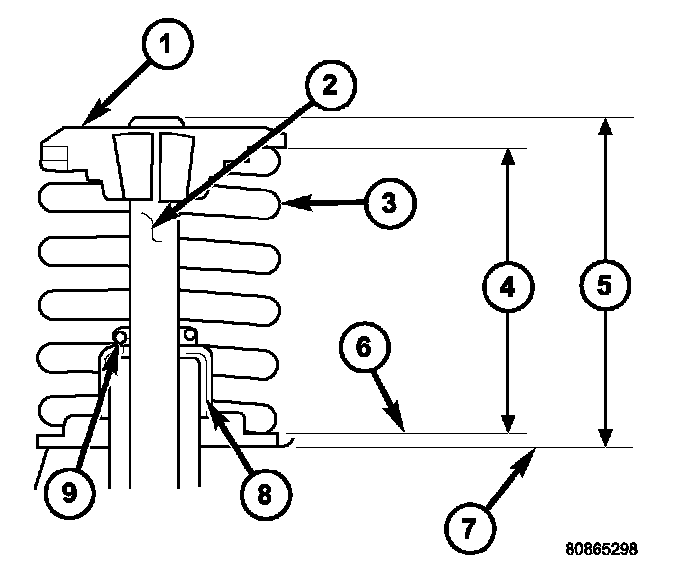4. Compress valve springs with a valve spring compressor install locks and release tool. If valves and/or seats are reground, measure the installed height of springs (4), make sure measurements are taken from top of spring seat (6) to the bottom surface of spring retainer (1). If height is greater than 38.75 mm (1.5256 inch), install a 0.762 mm (0.030 inch) spacer in head counterbore under the valve seal/spring seat (8) to bring spring height back within specification.