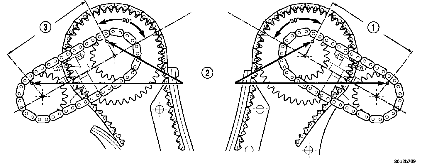 4. Count chain pins from the mark on the intake camshaft towards the exhaust camshaft (1 & 3). Engine is timed correctly when there are 12 chain pins between the timing marks (2) on the intake camshaft and exhaust camshaft.
