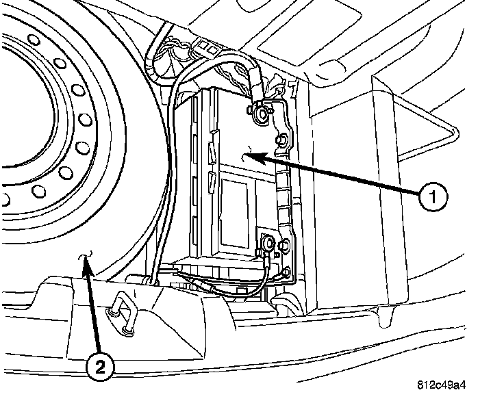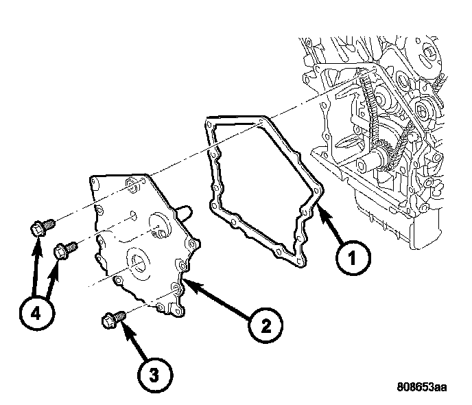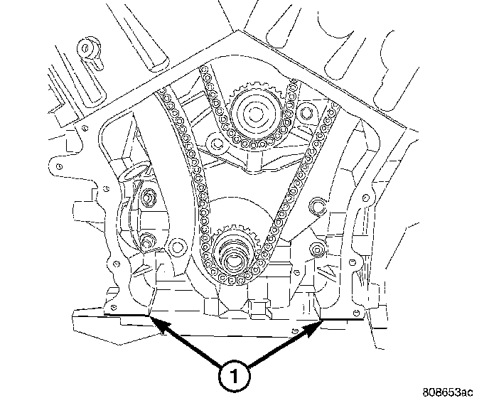 2. Before installing timing cover gasket apply a 1/8 inch bead of Mopar(R) Engine RTV GEN II to the parting lines between the oil pan and cylinder block (1).