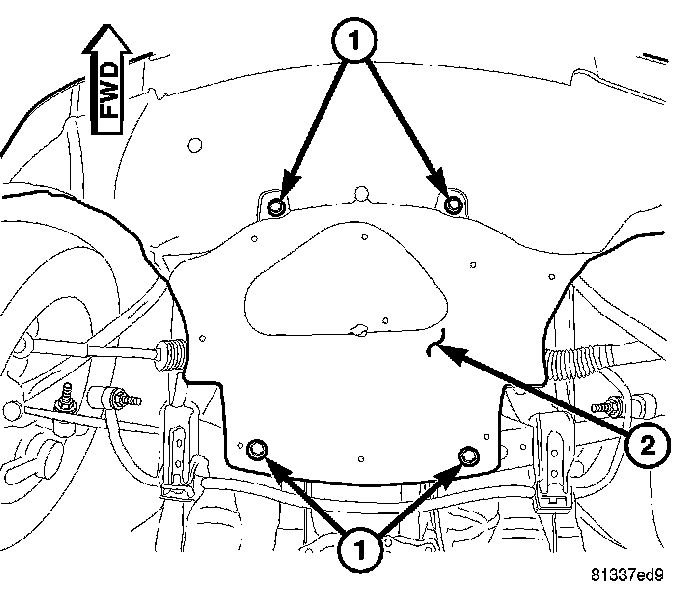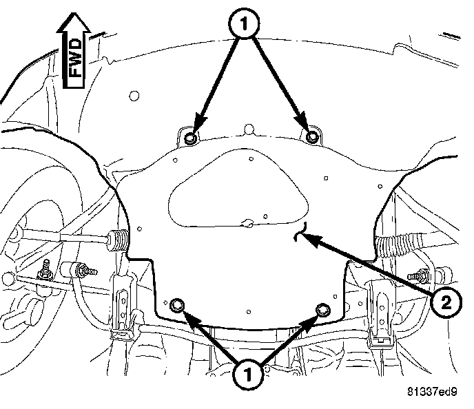 5. Remove lower splash shield retaining bolts (1) and splash shield (2).