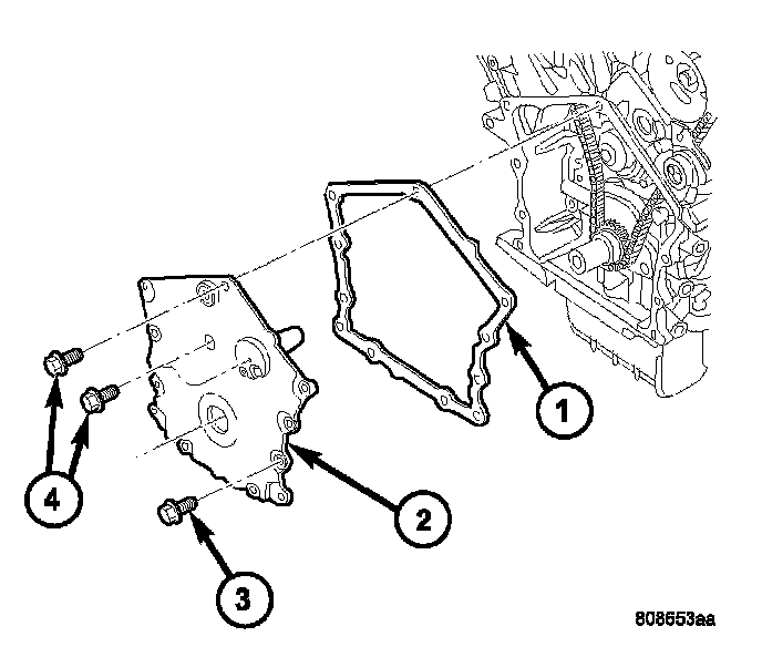 3. Install timing cover (2) and gasket (1). Tighten M10 cover bolts (4) to 54 Nm (40 ft. lbs.) and M6 bolts (3) to 12 Nm (105 inch lbs.).