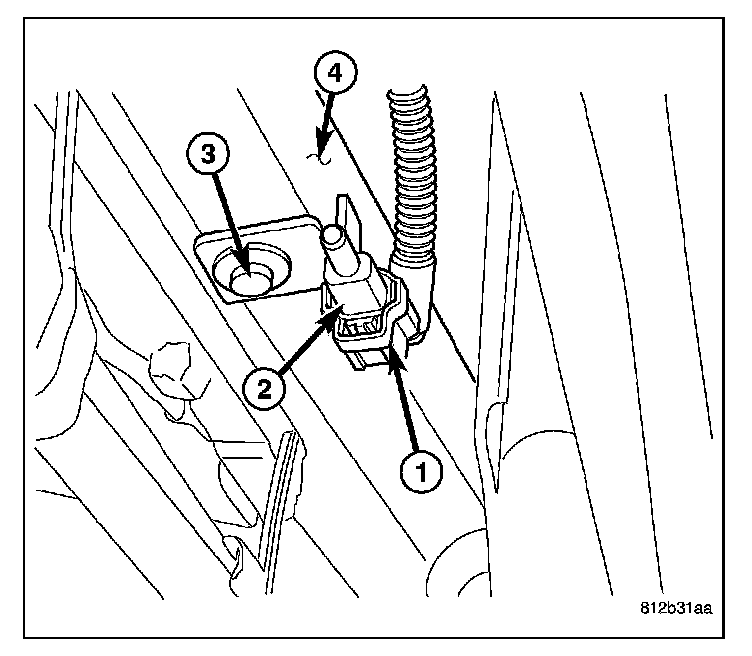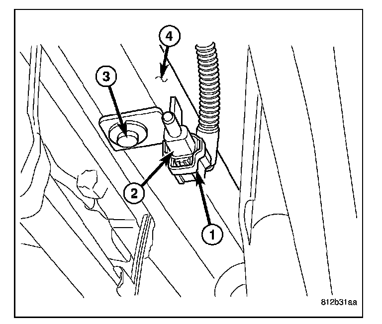 1. Position the ambient air temperature sensor (2) onto the bottom of the front bumper beam (4).