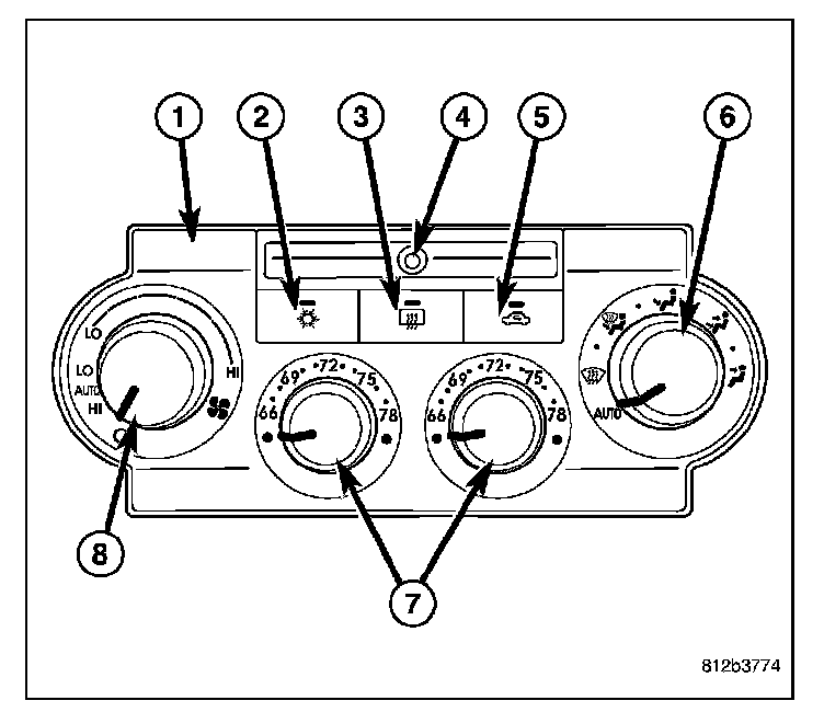 The A/C-heater control (1) for the automatic temperature control (ATC) dual zone heating-A/C system allows both the driver and the front seat passenger the ability to individually regulate air temperature for their side of the vehicle. All controls are identified by ISO graphic symbols.
