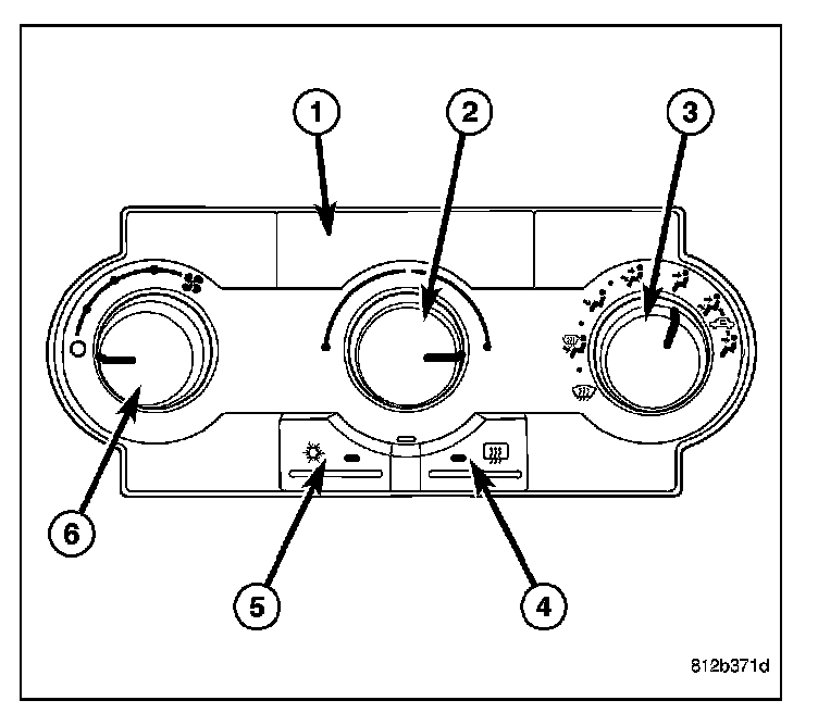- a push button rear window defogger on/off control (4). The defogger button contains an LED that illuminates when the rear window defogger system is in operation.
