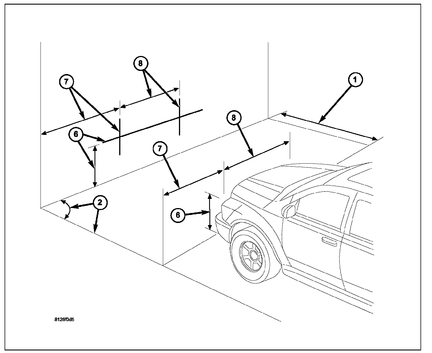 2. An adjacent wall or floor member that is perpendicular to the alignment screen can be used as the vertical zero reference. If there is no adjacent wall or floor member that is perpendicular to the screen, tape a second line on the floor perpendicular to both the alignment screen and the first line, and outboard of either side of where the vehicle will be positioned. This will be used as the vertical zero reference.