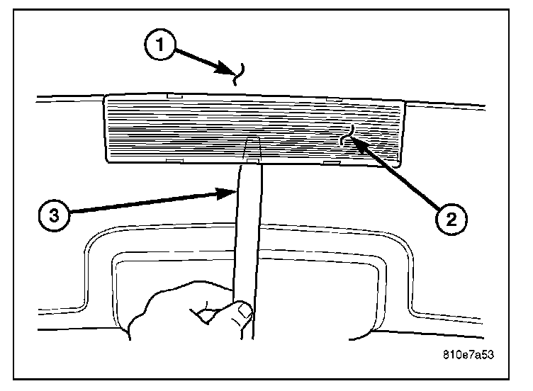 3. Using a trim stick (3) (special tool #C-4755) or equivalent, gently pry out on liftgate lamp lens (2) and remove from trim panel (1).