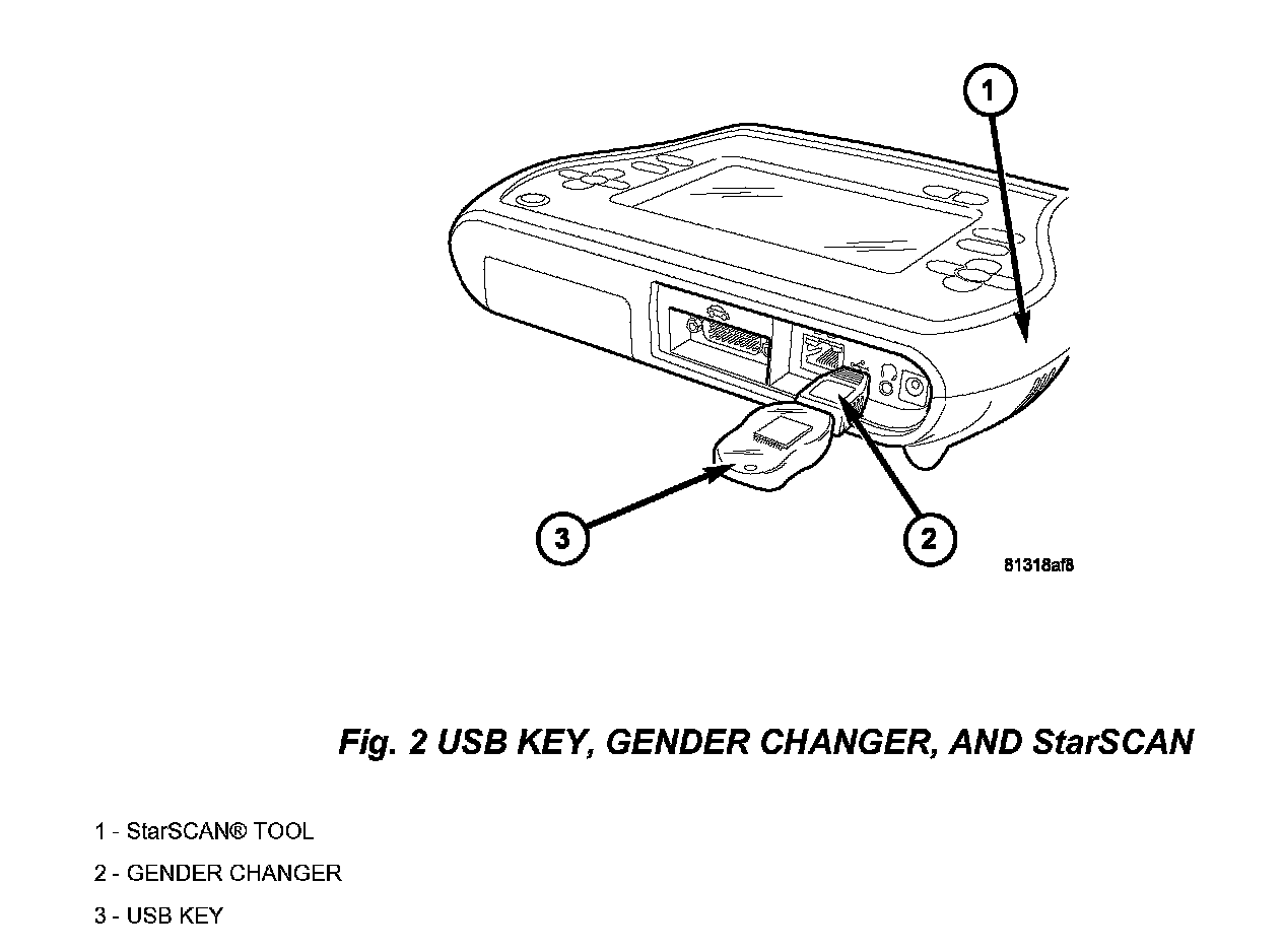 8. With the StarSCAN(R) powered OFF, connect the USB Key and Gender Changer to the StarSCAN(R) USB port (Fig. 2).