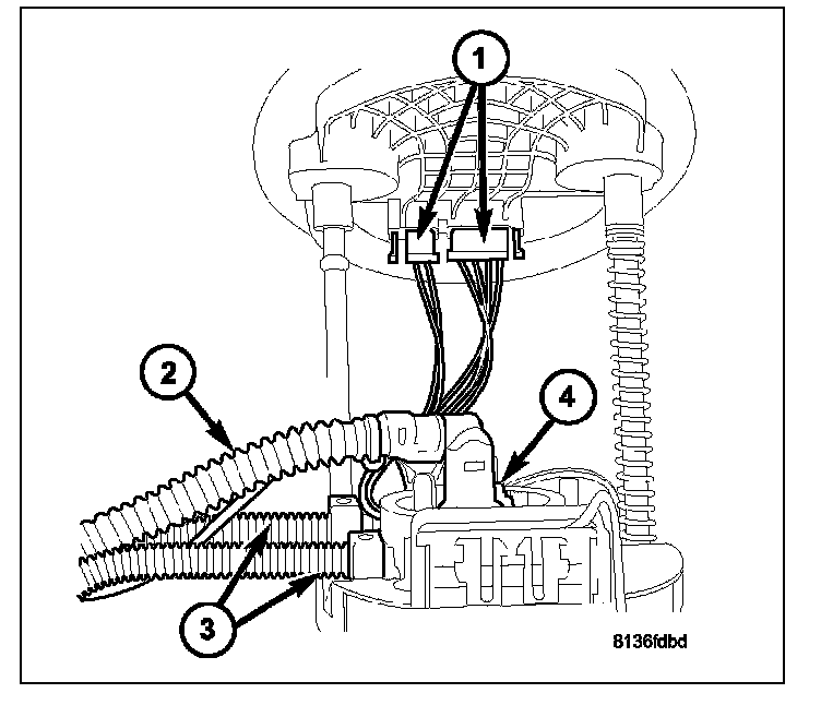 4. Connect the electrical connectors for right side fuel level sending card, left side module card and fuel pump.