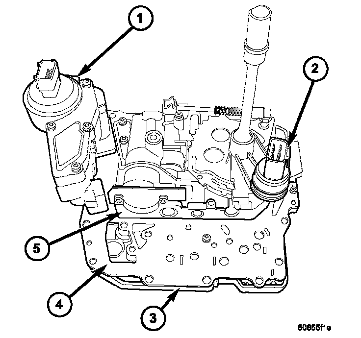 The Transmission Range Sensor (TRS) (2) is mounted to the top of the valve body inside the transmission and can only be serviced by removing the valve body assembly. The electrical connector extends through the transmission case.