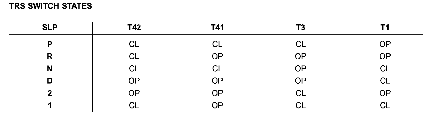 Since there are four switches, there are 16 possible combinations of open and closed switches (codes). Seven of these codes are related to gear position and three are recognized as "between gear" codes. This results in six codes which should never occur. These are called "invalid" codes. An invalid code will result in a DTC, and the TCM will then determine the shift lever position based on pressure switch data. This allows reasonably normal transmission operation with a TRS failure.