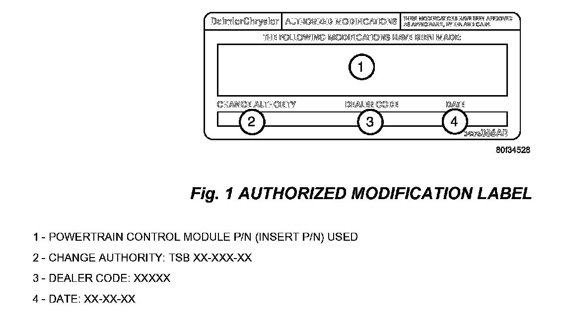 6. Type the necessary information on the "Authorized Modification Label" p/n 04275086AB and attach near the VECI label (Fig. 1).
