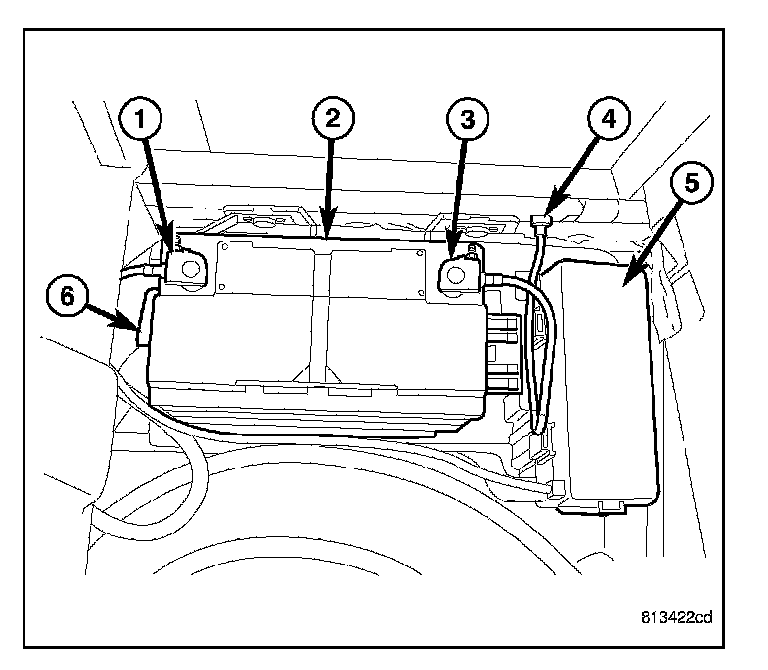 6. Remove the fastener securing the battery negative cable to the transmission housing.