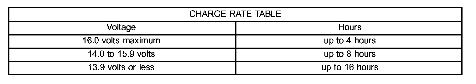 3. Battery chargers vary in the amount of voltage and current they provide. The amount of time required for a battery to accept measurable charging current at various voltages is shown in the Charge Rate Table. If the charging current is still not measurable at the end of the charging time, the battery is inoperative and must be replaced. If the charging current is measurable during the charging time, the battery may be good and the charging should be completed in the normal manner.