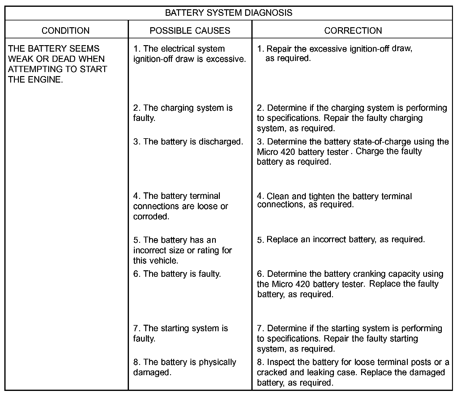 The battery, starting, and charging systems in the vehicle operate with one another and must be tested as a complete system. In order for the engine to start and the battery to maintain its charge properly, all of the components that are used in these systems must perform within specifications. It is important that the battery, starting, and charging systems be thoroughly tested and inspected any time a battery needs to be charged or replaced. The cause of abnormal battery discharge, overcharging or early battery failure must be diagnosed and corrected before a battery is replaced and before a vehicle is returned to service. The systems has been separated to make it easier to locate the specific information you are seeking. However, when attempting to diagnose any of these systems, it is important that you keep their interdependency in mind.The diagnostic procedures used for the battery, starting, and charging systems include the most basic conventional diagnostic methods, to the more sophisticated On-Board Diagnostics (OBD) built into the Powertrain Control Module (PCM). Use of an induction-type milliampere ammeter, a volt/ohmmeter, a battery charger, a carbon pile rheostat (load tester) and a 12-volt test lamp may be required. All OBD-sensed systems are monitored by the PCM. Each monitored circuit is assigned a Diagnostic Trouble Code (DTC). The PCM will store a DTC in electronic memory for any inoperative system it detects.