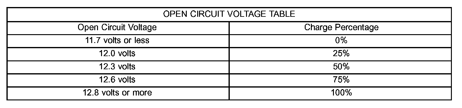 See the Open-Circuit Voltage Table. This voltage reading will indicate the battery state-of-charge, but will not reveal its cranking capacity. If a battery has an open-circuit voltage reading of 12.4 volts or greater, it may be load tested to reveal its cranking capacity.