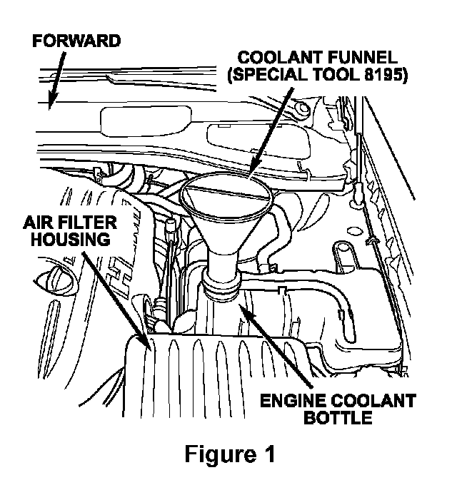 d. Attach funnel tool (Special Tool # 8195) to the engine coolant bottle opening (Figure 1).