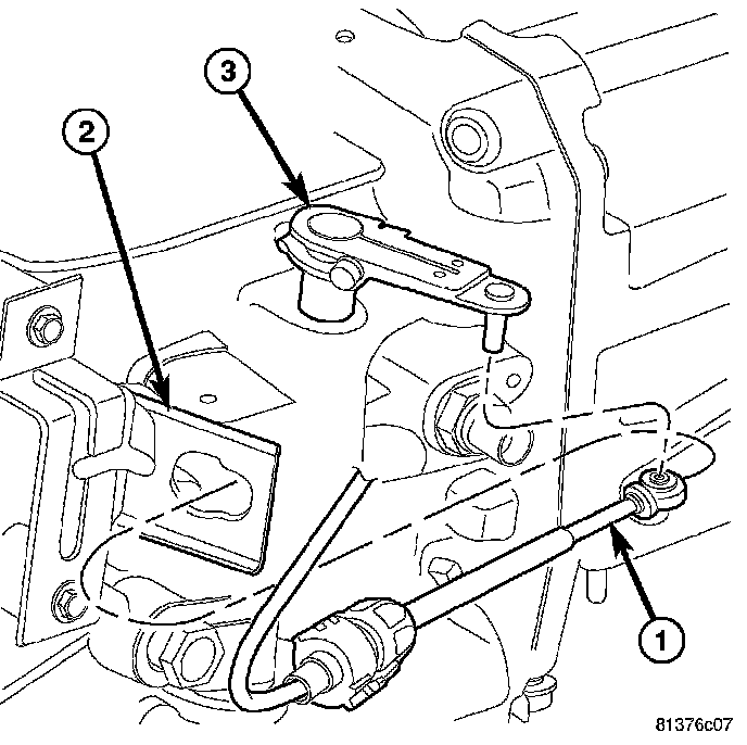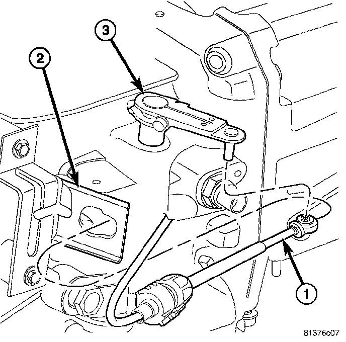 3. Disengage the gearshift cable (1) eyelet at transmission manual shift lever (3) and pull cable out of mounting bracket (2).