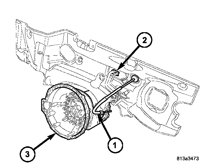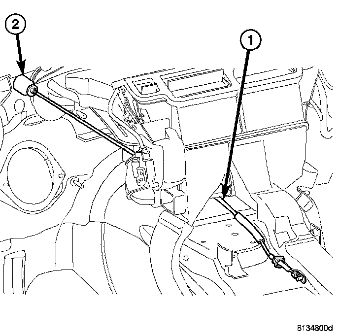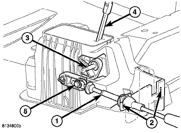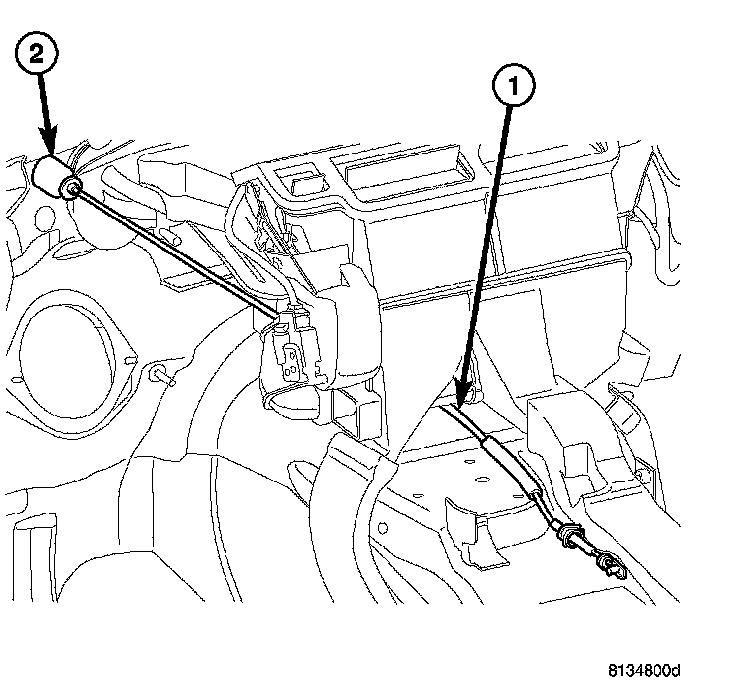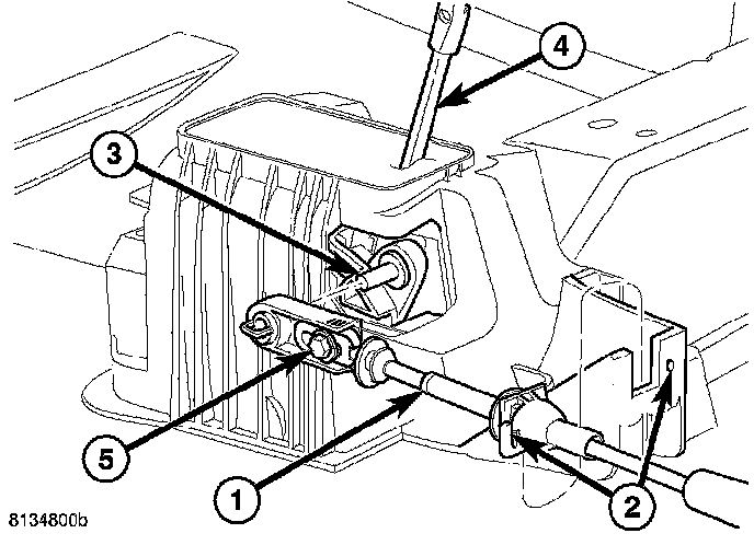 1. From under the hood, route the gearshift cable (1) through the dash panel and toward the shifter assembly.