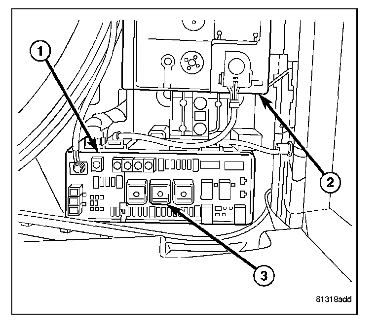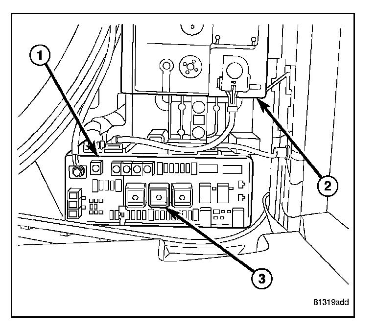 1. Position the EBL relay (3) into the proper receptacle of the power distribution center (PDC) (1) located at the rear of the vehicle near the battery (2).