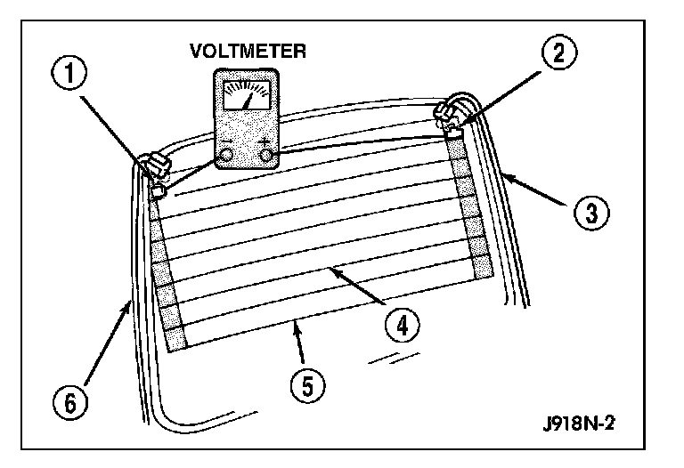 3. If a temperature difference is not detected, use a 12-volt DC voltmeter and contact the rear glass heating grid terminal A (1) with the negative lead, and terminal B (2) with the positive lead. The voltmeter should read battery voltage. If the voltmeter does not read battery voltage, check the following: