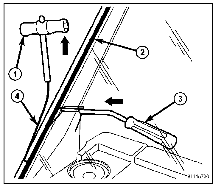 5. Using an assistant and a wire-type windshield cutout tool (1, 3 and 4), cut and separate the urethane adhesive (2) securing the backlite to the backlite fence.