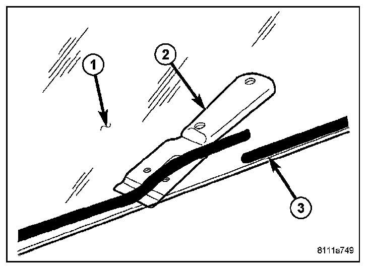 2. Using a razor knife (2), level the original bead of urethane (1) on the backlite fence (3) to a thickness of approximately 1 mm (0.04 in.) and remove the loose adhesive.