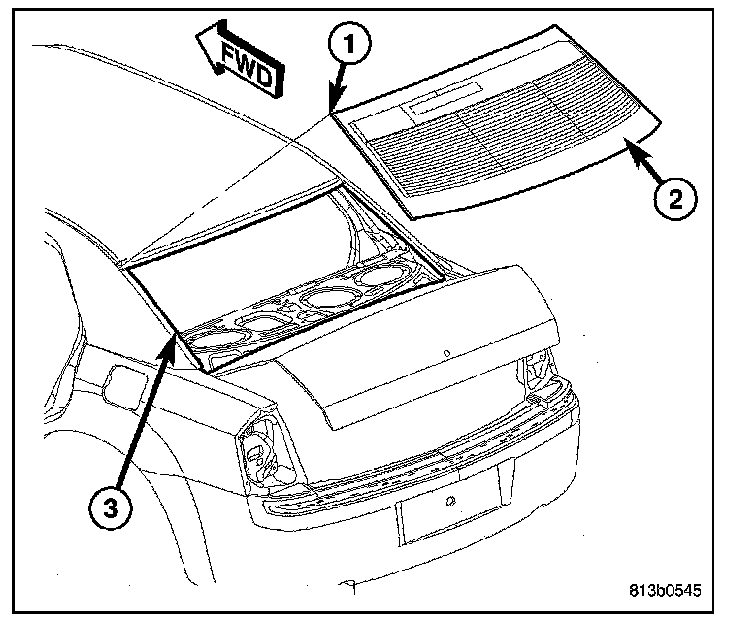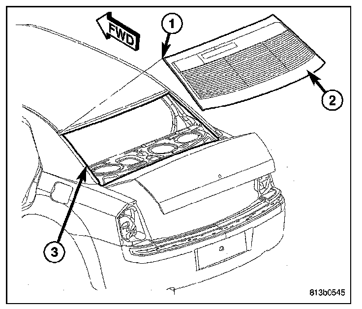 3. Install a new rubber seal (1) around the top and side edges of backlite (2).