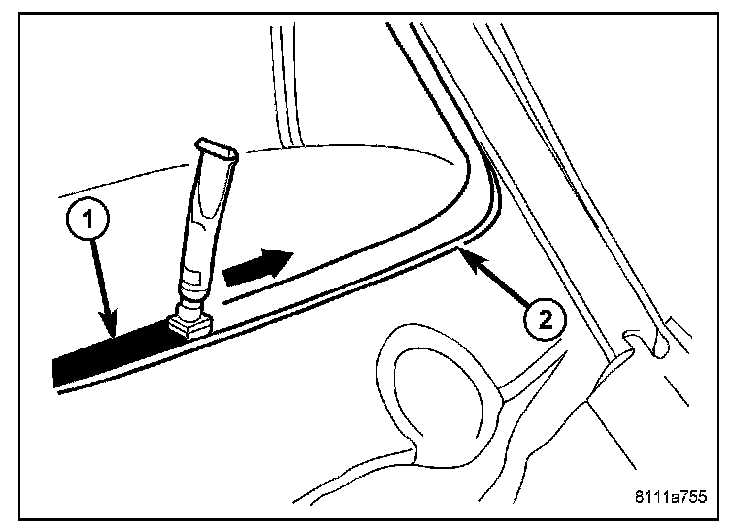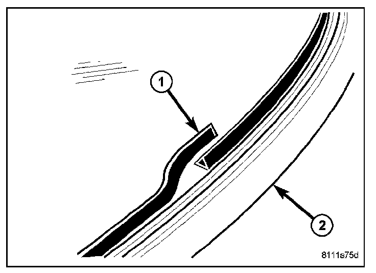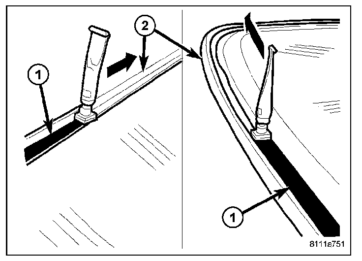 18. Run the end of the adhesive bead (1) on the backlite (2) parallel to the start of the bead and smooth the ends flush.