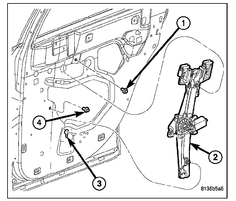 5. Install and tighten the screw (4) that secures the regulator motor support bracket to the inside of the door. Tighten the screw to 10 N.m (90 in.lbs.).