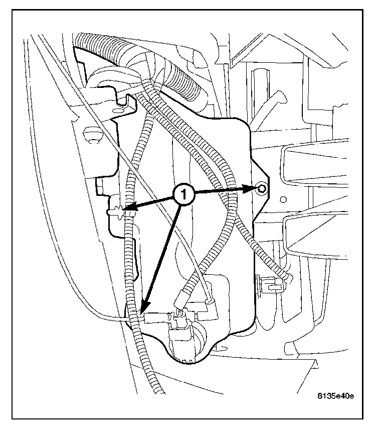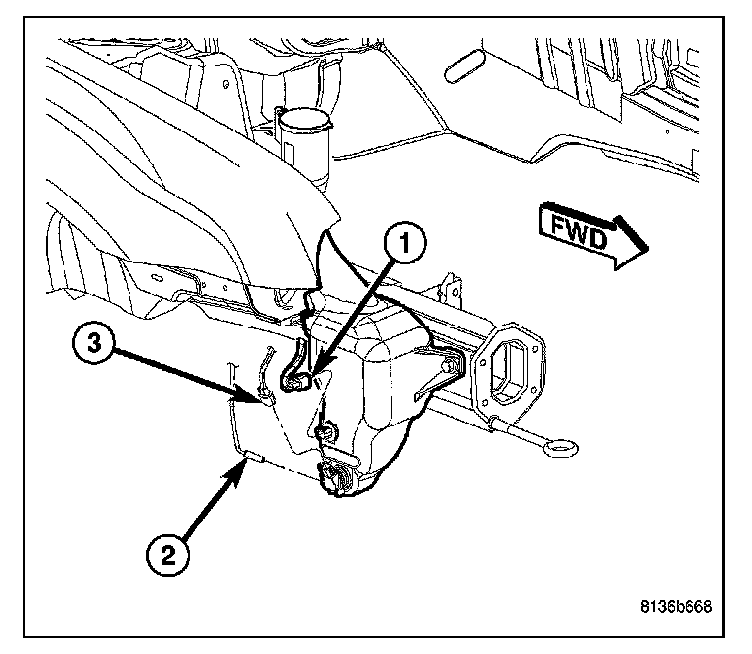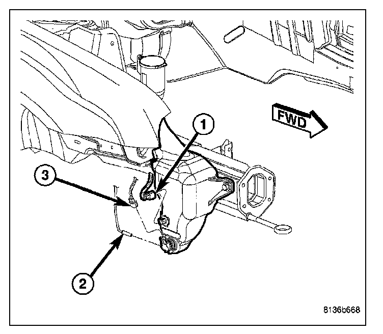 2. Drain washer fluid from the reservoir and into a suitable clean container. This can be done by disconnecting the windshield washer hose from the front (outboard) washer pump and allowing the washer fluid to drain into a container through a temporary jumper hose connected to the front washer pump.
