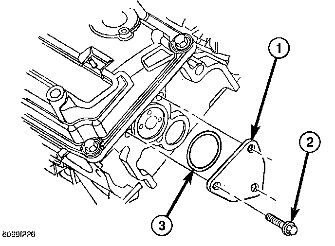 2. Install the camshaft thrust plates (1) and O-ring (3). Tighten bolts (2) to 28 Nm (250 inch lbs.).